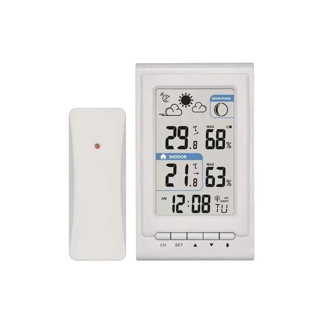 Бездротова метеостанція E0352 від чеського виробника EMOS Метеостанція з чітким цифровим дисплеєм надає актуальну інформацію про поточний час, дату, температуру, вологість, фази місяця й передусім прогноз погоди, доступний на наступні 12-24 години. Температура вимірюється як у приміщенні, і на вулиці. Обладнана бездротовим погодостійким датчиком, з дальністю приймання сигналу до 30 м, може бути поєднана з такими 3 датчиками, і дані з них легко виводяться на дисплей.