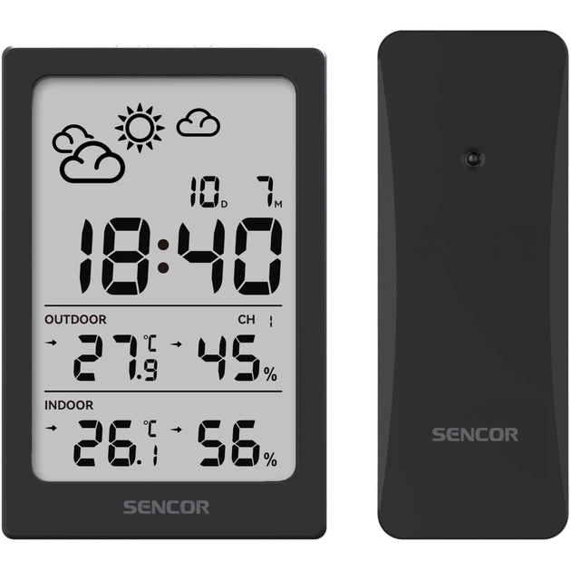 Метеостанція SENCOR SWS 2300 контролює температуру як у приміщенні, так і на вулиці в градусах Цельсія та Фаренгейта, а також рівень вологості у відсотках. Вона може прогнозувати погоду та відображати її за допомогою графічних значків (сонячно, мінлива хмарність, хмарно, дощ, сніг). Максимальні та мінімальні зареєстровані значення за останні 24 години автоматично зберігаються, що дозволяє переглядати їх. Дисплей також відображає поточний час. Ви можете встановити подвійний будильник для регулярних пробуджень.