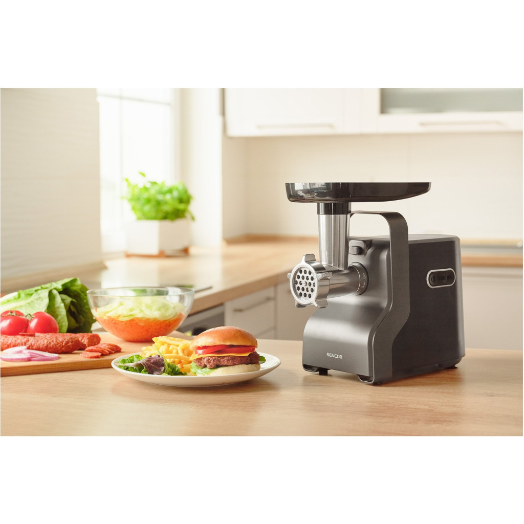 М'ясорубка Sencor - пристрій зі споживаною потужністю 2100 Вт, який здатний обробляти продукцію зі швидкістю 1,7 кг за хвилину. Вона обладнана трьома решітками для різних типів м'яса та додатковими насадками для ковбаси та кеббе. В комплекті також надаються чотири терки для різноманітної обробки продуктів. Корпус м'ясорубки виготовлений з міцного пластику та металу, надаючи їй надійність та довговічність. Її стильний чорний дизайн робить її не лише функціональним, але й естетичним елементом кухонного інтер'єру.