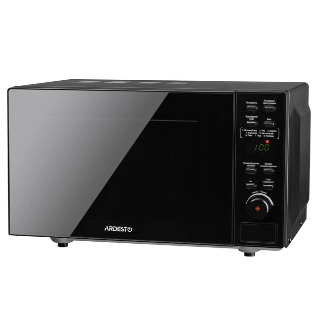 Нижнє розташування магнетрону та відсутність поворотного столу забезпечують рівномірний розподіл мікрохвиль та можливість використання посуду будь-якої форми. Для відкриття є клавіша, а для керування – вісім кнопок та поворотний перемикач. Клавіші відповідають за різні режими та налаштування, а перемикач – за регулювання часу та вибір програми приготування.