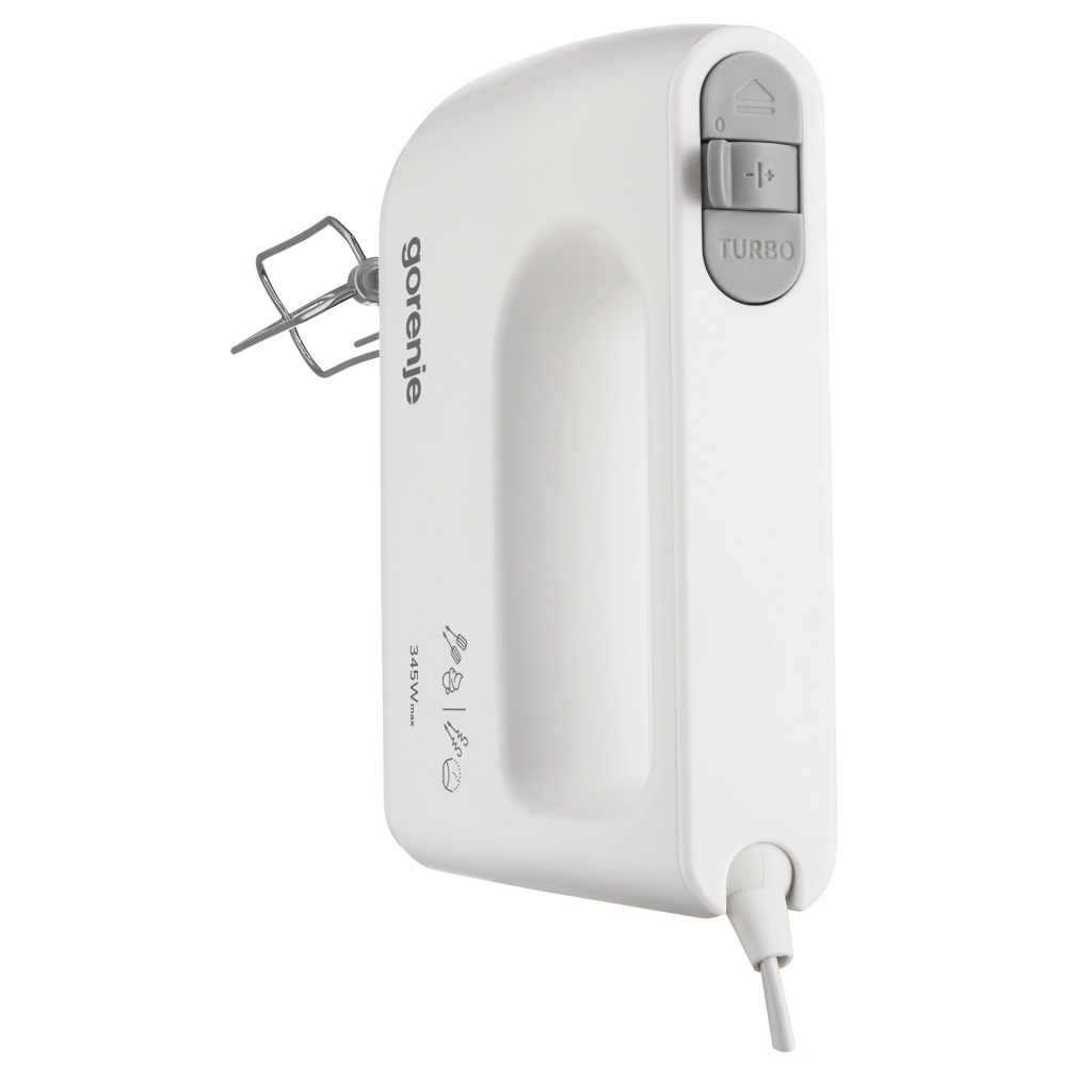На верхній площині ручки міксера Gorenje M360CW розташовані всі кнопки управління. Повзунковий регулятор зі зручним виступом легко регулює швидкість обертання насадок. 5 режимів роботи дозволяють розраховувати на відмінний результат при будь-якому варіанті використання. Є окрема кнопка турбо-режиму. Її натискання не фіксується, але дозволяє короткочасно підвищувати обороти до максимальної позначки. При цьому неважливо, який швидкісний режим був обраний.