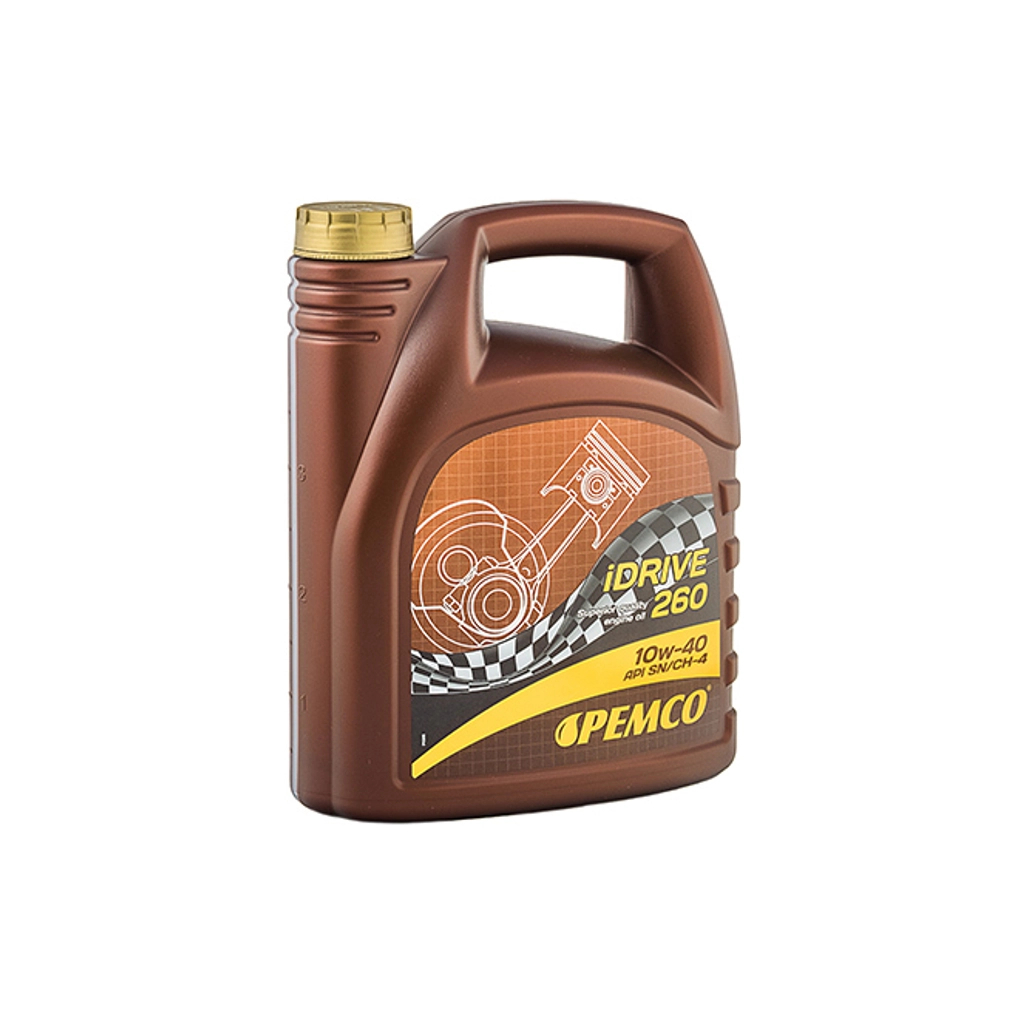 Pemco iDrive 260 — універсальна всесезонна напівсинтетична моторна олива. Містить унікальний пакет присадок, що забезпечує високі протизносні й енергоощадні властивості. Гарантує надійне змащення навіть за низьких температур довкілля. Ефективно запобігає утворенню лаків і нагарів. Розроблене для всіх сучасних типів двигуна, з турбонаддувом і без, багатоклапанних, з прямим упорскуванням, а також для двигунів, що працюють на газі.