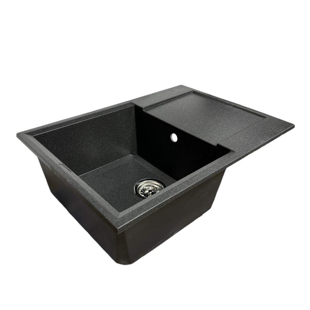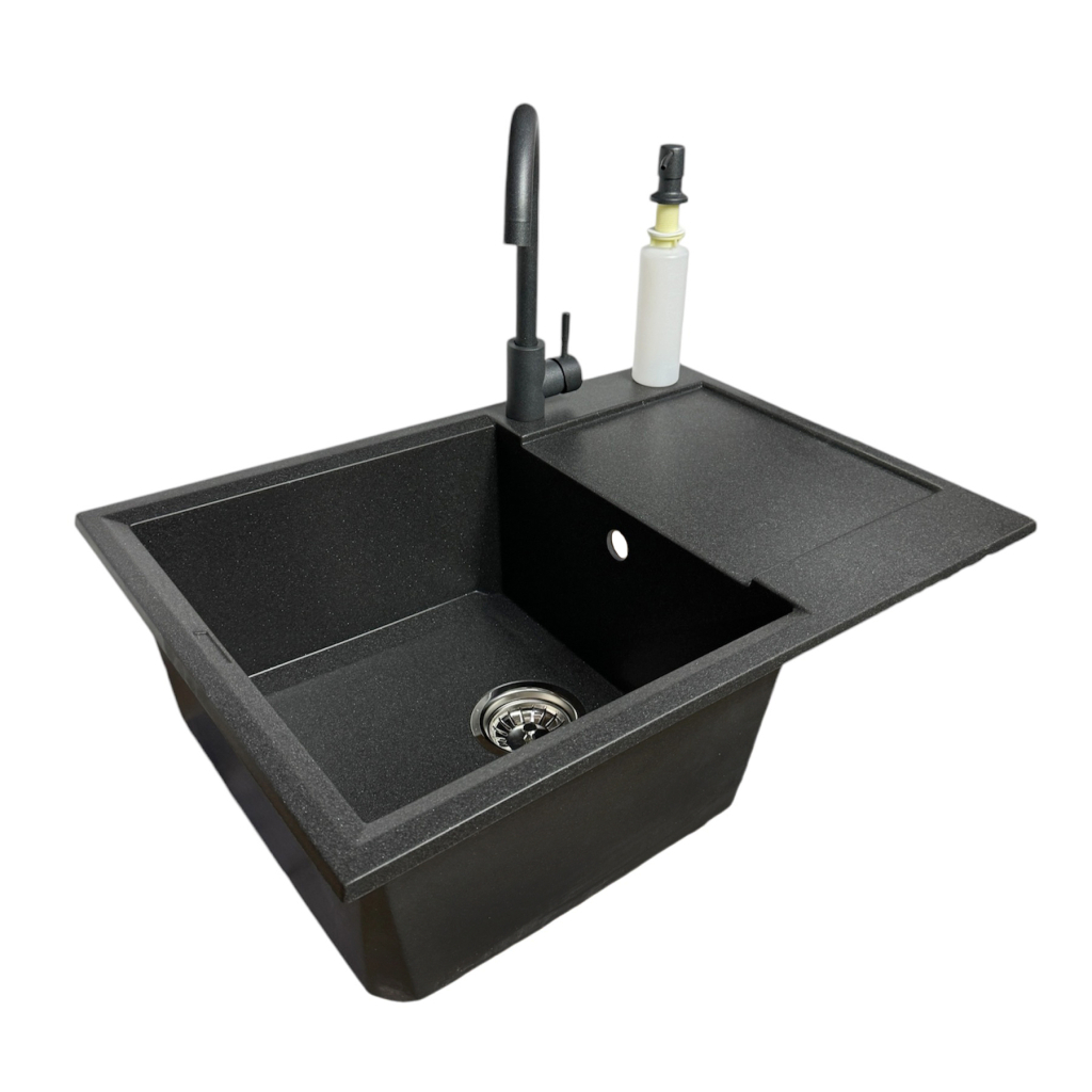 Кухонний набір Adamant Horizon Medium поєднує простору прямокутну мийку зі штучного каменю, змішувач та зручний дозатор. Глибока чаша та широке крило надають комфорт під час миття й підготовки продуктів. Матова поверхня зберігає охайний вигляд і легко очищується. Технологія Solid Surface забезпечує високу міцність та стійкість до впливів. Це універсальне рішення для сучасного та функціонального кухонного простору.