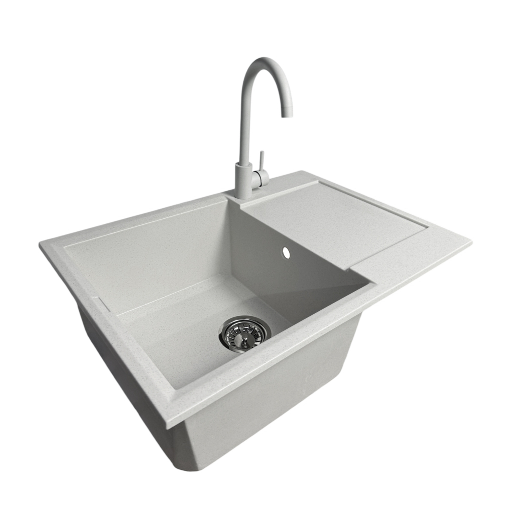Кухонний набір Adamant Horizon Medium поєднує містку прямокутну мийку зі штучного каменю та ергономічний змішувач для комфортної роботи. Глибока чаша та зручне крило створюють достатньо простору для миття посуду та обробки продуктів. Матова поверхня зберігає охайний вигляд навіть за частого використання. Технологія Solid Surface забезпечує високу довговічність та стійкість до впливу зовнішніх факторів. Це практичний вибір для сучасної кухні.