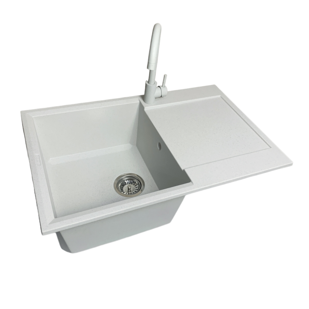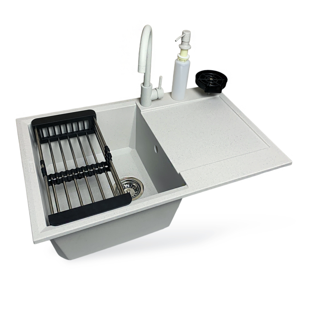 Набір Adamant Horizon поєднує простору мийку зі штучного каменю, змішувач, дозатор, коландер та ополіскувач для склянок, створюючи зручний багатофункціональний комплекс для кухні. Глибока чаша й крило дозволяють комфортно працювати з великим посудом. Матеріал Solid Surface забезпечує високу стійкість до температур і щоденних навантажень. Елементи набору мають захисне покриття для тривалого використання. Це практичне рішення для сучасних кухонних інтер’єрів.