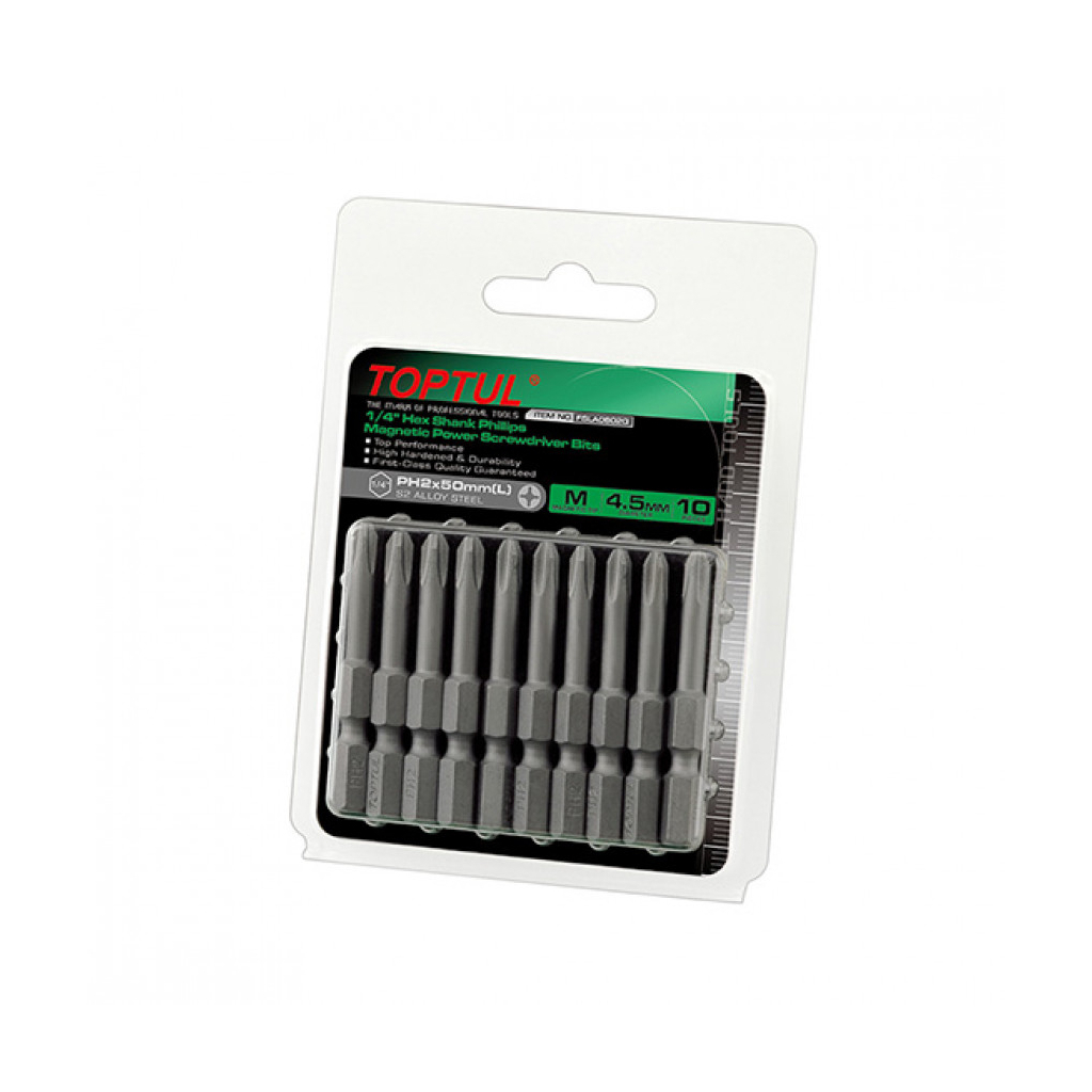 Набір біт Toptul для шуруповертів магнітних 10шт 1/4" 50мм PH2 (FSLA0802G)
