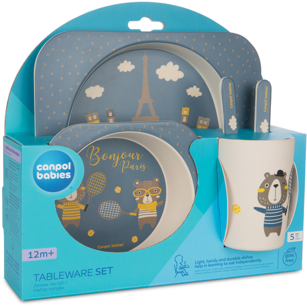 Набір посуду Canpol Babies Bonjour Paris - це екологічно чиста альтернатива класичному посуду з пластику. Набір посуду виготовлено з міцних, стійких та придатних для контакту з харчовими продуктами матеріалів з використанням натуральної сировини –50% деревного борошна і 30% харчового кукурудзяного крохмалю (і 20% меламінової смоли).