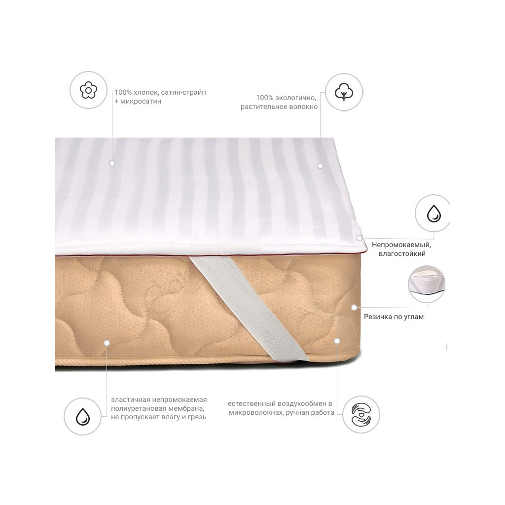 Наматрацник не пропускає бруд і здатний утримувати до 0,5 л води (завдяки чому ваш матрац завжди залишатиметься сухим і чистим!). І, на відміну від інших непромокальних наматрацників, він практично не шарудить завдяки еластичній непромокальній мембрані.