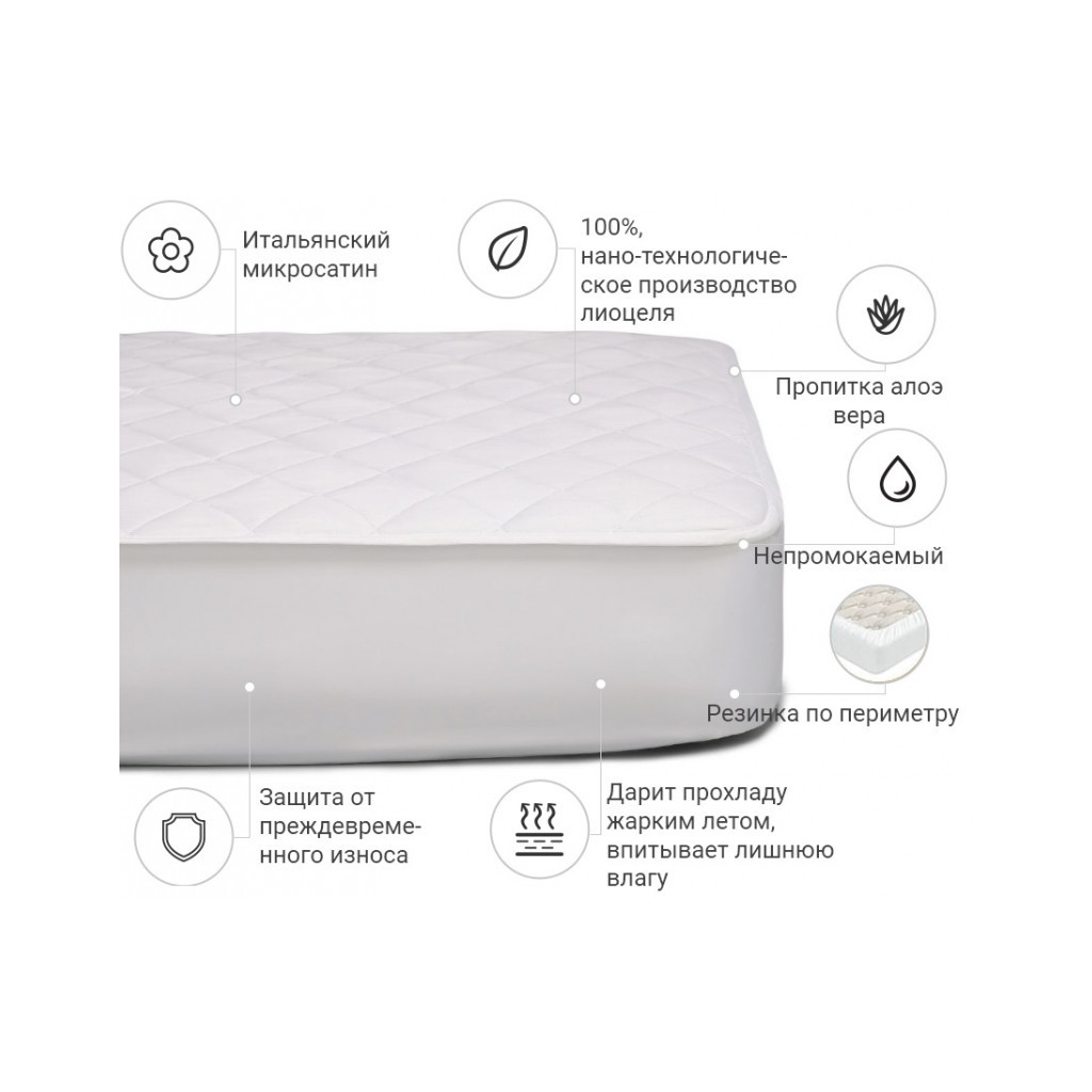 Сам наматрацник виготовлений із високоякісної тканини мікросатин — виробництва Італія. Наматрацник витримує понад 250 прань і водночас зберігає свій первісний вигляд. Тканина мікросатин — ніжна, приємна на дотик, сатинове плетіння забезпечує довговічність і м'якість усього виробу загалом. Наматрацник не ковзає по матрацу, добре фіксується.