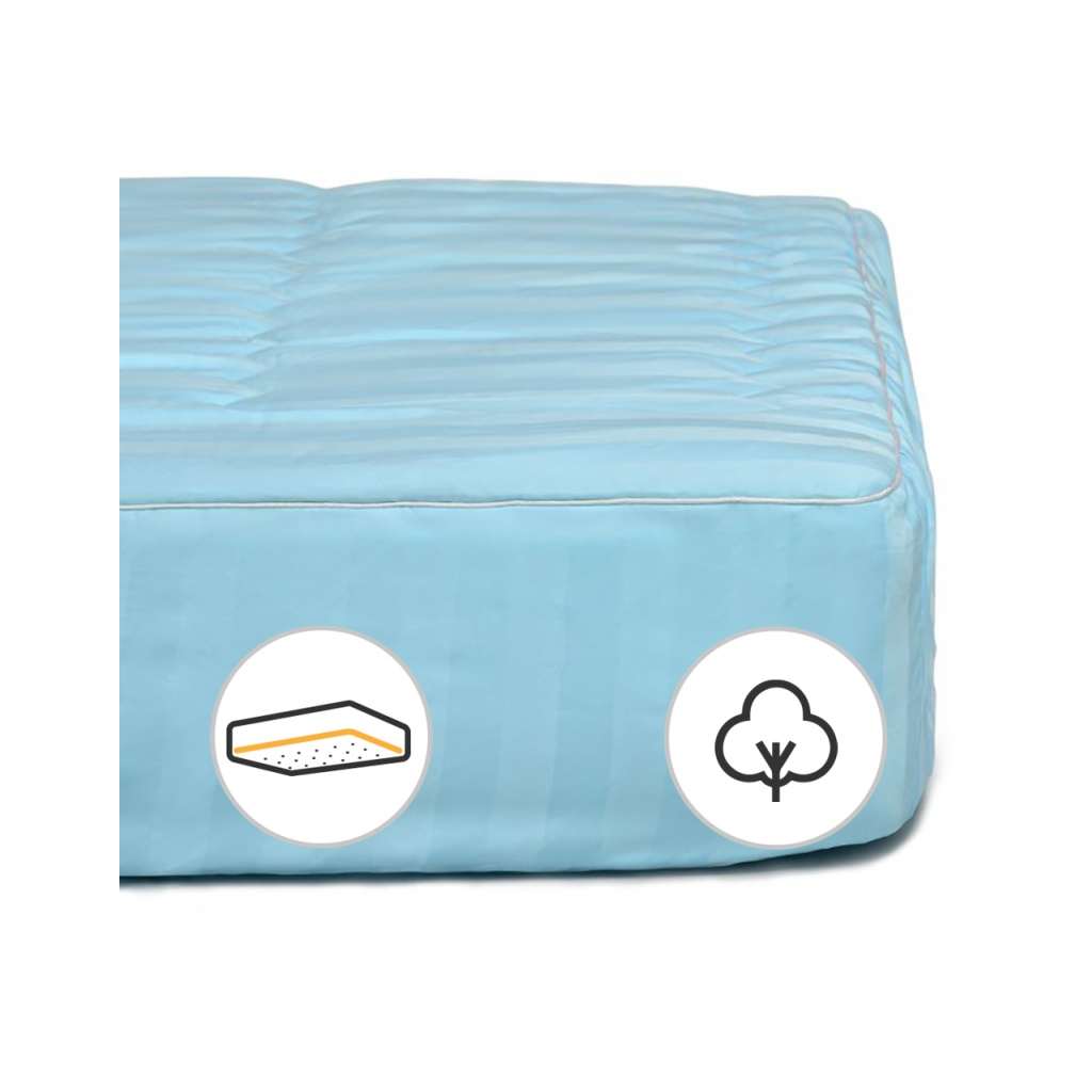 Наматрацник на гумці з високоякісної італійської тканини класу "Premium". Тканина має назву "Сатин-страйп Італія", яка є довговічною, складається виключно зі 100% високоякісного бавовняного волокна. Сатинова тканина чохла має складне жакардове переплетення, що надає наматрацнику не тільки високоестетичної вишуканість, але й збільшує міцність тканини загалом.