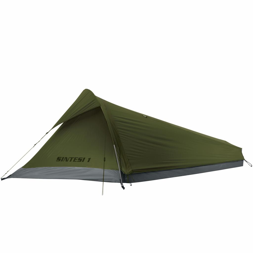 Ferrino Sintesi 1 Olive Green відноситься до серії наметів Ferrino Lite, важить менше кілограма в повній комплектації і є дійсно одним з найлегших одномісних наметів. Дана модель має підвищену до 8000 мм вод. ст. водонепроникність дна намету і найбільше підійде для змагань по легкоходному туризму, нетривалих одиночних походів і велотуризму, коли потенційно можливе випадання великої кількості опадів. Тунельна конструкція даного намету забезпечує мінімальну вагу і мінімальний час установки. Водозахист зовнішнього тенту становить 3000 мм вод. ст., що вдвічі перевищує нормативні вимоги до водозахисних наметів і цілком вистачає, щоб зберегти намет всередині сухим під час дощу середньої інтенсивності. Намет має один вентиляційний отвір і вхід, додатково закривається москітною сіткою, таким чином ефективне провітрювання здійснюється без проблем і ночівля в літню спеку не викличе дискомфорту.