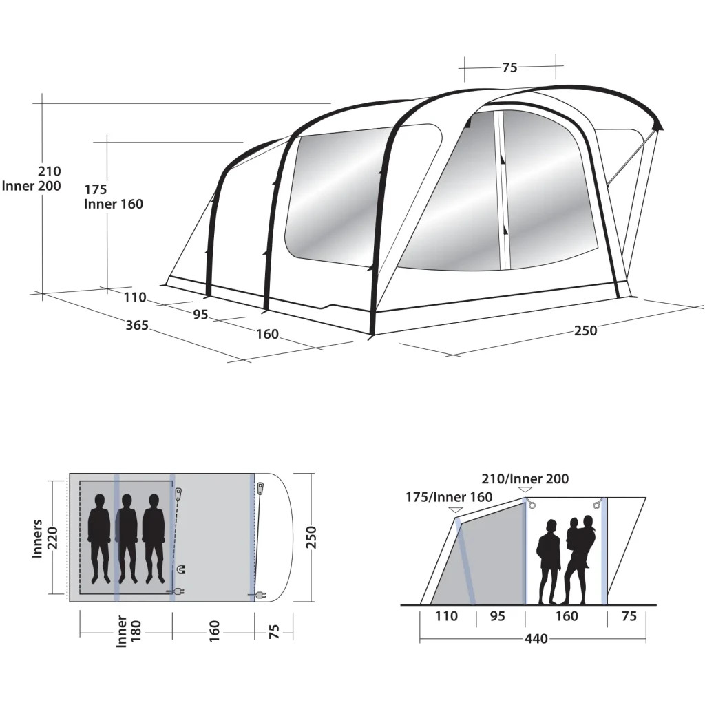 - Outwell Rigid Air System — опорні балки каркаса намету надуваються і здуваються незалежно одна від одної завдяки зручному доступу до спускових клапанів.