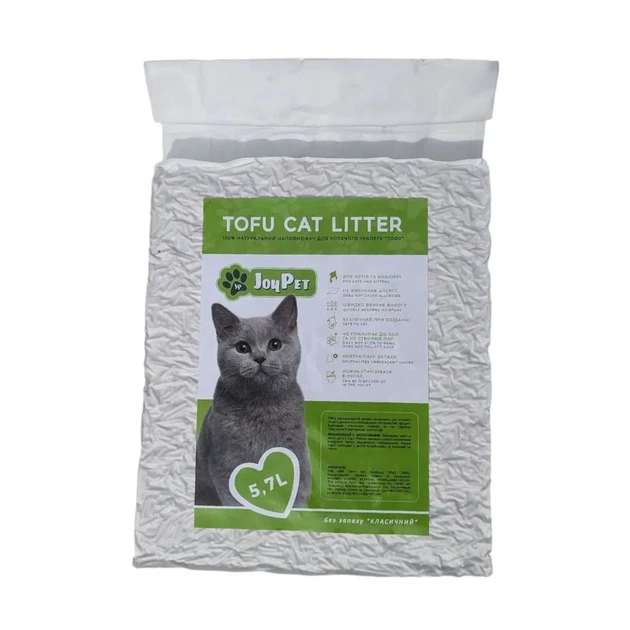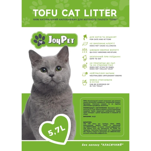 TM JOYPET TOFU - біорозкладний соєвий наповнювач для котячого уталету рослинного походження. Натуральний продукт. Віповідає гігієнічним нормам та не підлягає обовєяковій сертифікації. Безпечний.