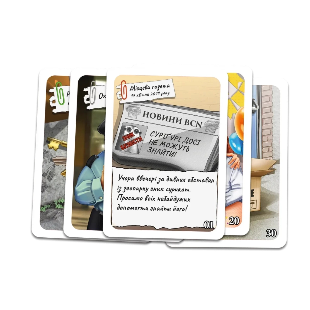 Комплект складається з 32 карт і інструкції, які допоможуть вам втягнутись у розв'язання цієї захопливої загадки. Перемішайте карти та розподіліть їх серед гравців. У кожному раунді важливо правильно обрати: відкрити карту чи залишити її скритою, створюючи свою власну картину подій.