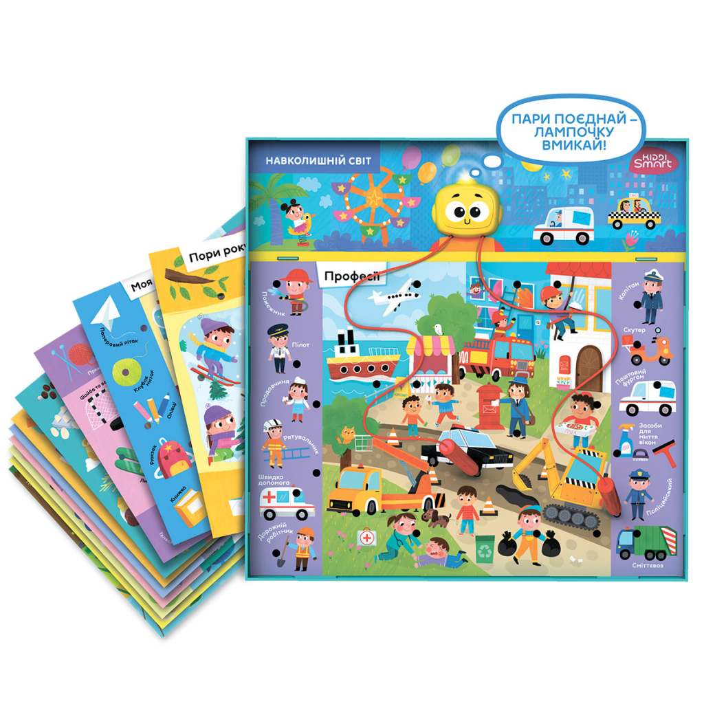 До комплекту включені електронна основа та 12 ігрових полів, що робить гру зручною та різнобічною. Забезпечте дитині не лише цікаву гру, а й корисні навички разом з Kiddi Smart Вікторина Навколишній світ!