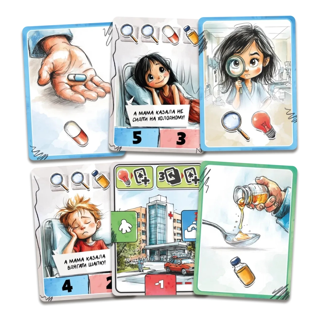 Якість та унікальність цієї гри полягає в її оригінальності. Комплект містить 60 двосторонніх карт дій/пацієнтів, що створює незліченну кількість стратегій та варіантів розвитку подій. Завдяки простим правилам, гра стає доступною як для дітей, так і для дорослих. Вибір карт залежить від вашої стратегії: чи обрати всі карти з однаковою дією, чи одного кольору. Використання карти-джокера додає грі додаткової інтриги.