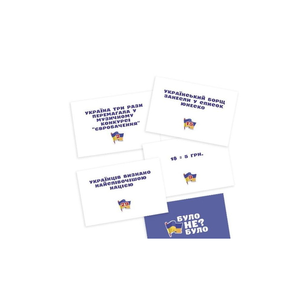 Було не було? В сучасній Україні: зміцни духовну незалежність! Чи пишаєтеся ви досягненнями та культурою своєї батьківщини? Чи бажаєте зберігати культурні особливості та ідентифікувати себе як корінний представник українського народу? Чи прагнете захищати інтереси батьківщини та своїх земляків? Вітаємо тоді ви справжнісінький патріот! І щоб відповідати на повну, треба бути духовно незалежним і підкованим знаннями про рідну країну. Тому що допомагати рідній країні це не тільки не смітити на вулиці й не псувати пам'ятники архітектури, це насамперед знати її історію від а до я та передавати ці знання іншим. Пропонуємо зіграти у настільну гру Було не було? В сучасній Україні українською мовою від компанії PLAYROOM, щоб відтворити в пам'яті події, що відбулися, вже в незалежній Україні та закріпити їх на довгі роки. Час позбудеться хибних упереджень раз і назавжди! Президентом України було обрано людину із судимістю? Було! Досі не зрозуміло, як таке могло статися, і напевно це найбільша помилка всього українського народу, за яку таке почуття, що ми розплачуємося до цього дня. А пам'ятаєте ті чудові часи, коли долар був по п'ять? І звичайно ж вже ні для кого не секрет, що наш найсмачніший борщ занесений до списку ЮНЕСКО. Так, саме такі факти доведеться дізнатися тим, хто до цього їх не знав і згадати тим, хто трохи забув. В ігровому наборі 55 карт із твердженнями, для гри вам знадобиться компанія від двох осіб. Учасники по черзі тягнуть карти із твердженнями, зачитують їх вголос і висувають свої припущення чи відбувалася така ситуація у незалежній Україні чи ні. Якщо гравець відповідає однозначно «було» або «не було» і ця відповідь правильна він заробляє один бал, але, якщо в його пам'яті є докладне пояснення даній події, а саме в якому році вона сталася і за яких обставин, у нього є можливість викласти всі подробиці, щоб заробити на такій відповіді два бали. За неправильну відповідь учасники не заробляють балів, але одержують корисні знання про рідну країну. Настав час перевірити один одного та дізнатися які новини були фейковими! Чи прожив українець на чердаку свого будинку 57 років? Чи брав участь у «Холостяку» депутат від Слуги народу? Чи знімалися в Україні сцени для фільму Агент 007? Дізнайтесь правду разом! Спекулювати на темі української історії пропаганді більше не вдасться! Було не було? В сучасній Україні – це цікава інтелектуальна карткова гра вікторина для всієї родини. Рекомендовано долучати дітей до гри з десяти років, але в сучасному світі діти настільки інтелектуально розвинені і знаходяться в курсі багатьох подій, що відбуваються, тому така рекомендація умовна і спирайтеся індивідуально на знання та розвиток своєї дитини. Якщо вона виявляє відвертий інтерес до гри з шести років, то чому б і не відкрити їй завісу знань про сучасну Україну. Коробочка з грою дуже компактна, тому її можна брати із собою куди завгодно, в дорогу, на вечірку і навіть увечері в парк, щоб зіграти на лавці під ліхтарем. Провести відверті розмови в компанії друзів чи наодинці ви зможете з настільними іграми Було не було? Для компанії чи Було не було? Для пар, ну дуже пікантні питання вас чекають у цих невеликих коробочках! Знання – це абсолютна цінність нашого часу… Тож давайте їх поповнювати!