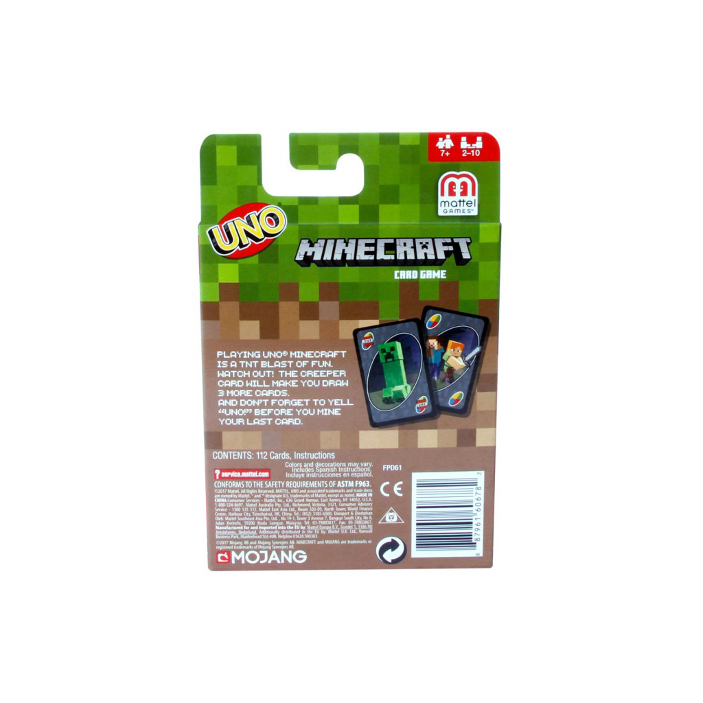 А ще в UNO Minecraft з'являється нова картка дії: якщо ти витягнув картку з Кріпером, обов'язково покажи її іншим гравцям — їм доведеться взяти з колоди по 3 картки кожному! Мета гри — скинути всі картки. Хто першим набере 500 балів — той і переможець. Головне — не забувати викрикувати "Уно!", коли на руках залишається 1 картка! У наборі 112 карток і правила гри. Одночасно може грати від 2 до 10 учасників віком від 7 років. Кольори та зовнішній вигляд можуть різнитися. Легко навчитися, неможливо зупинитися!