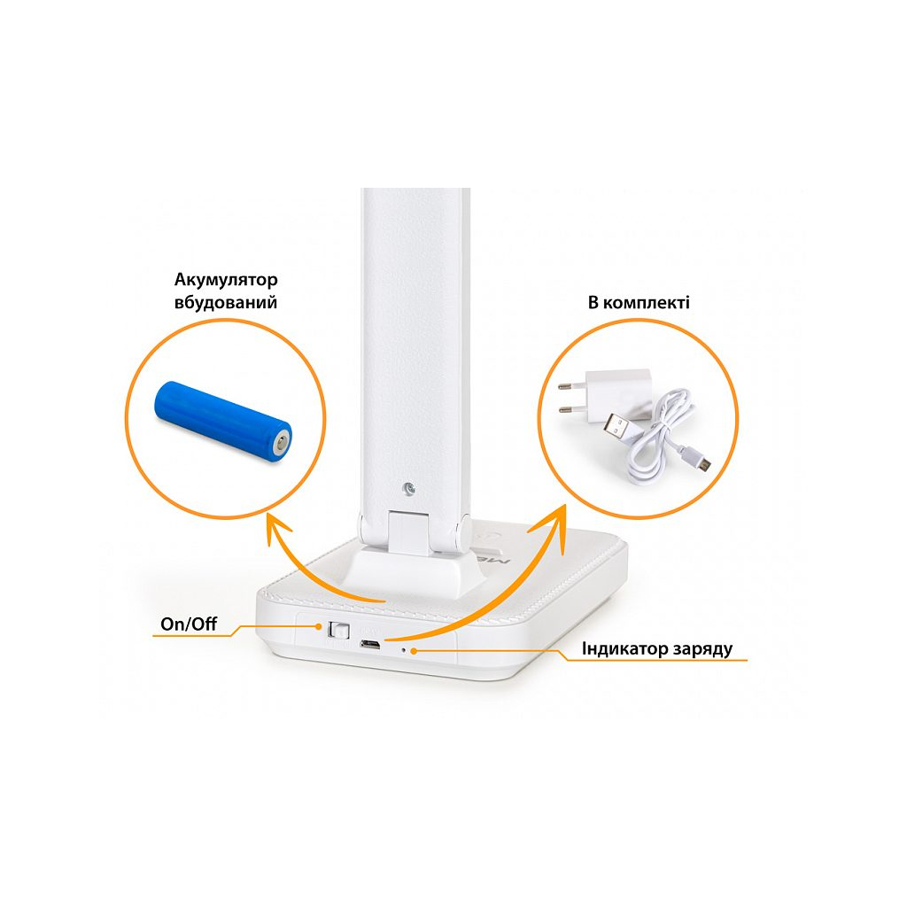 Головна особливість настільної світлодіодної лампи Mealux – наявність вбудованого акумулятора ємністю 1200 мАг. При повному заряді і на максимальній яскравості тривалість світіння становить 3 години. В комплект входить блок живлення та USB-кабель для зарядки. Лампа має три режими освітлення (тепле, холодне, природнє). Правильно підібраний режим освітлення покращить продуктивність і вбереже очі дитини від зайвого навантаження. Крім того, можна плавно регулювати яскравість світіння завдяки сенсорній кнопці на панелі.