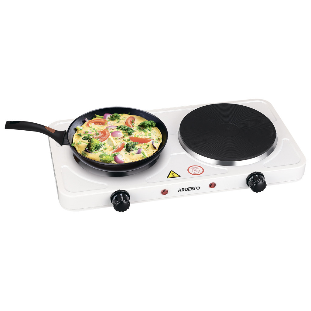 Електрична плита ECS-J225W білого кольору з двома конфорками діаметром 15,5 і 18,5 см й індикатором нагріву. Потужність однієї конфорки – 1 000 Вт, іншої – 1 500 Вт. Чудово підійде для приготування різноманітних страв вдома, на дачі, в гуртожитку, в умовах кемпінгу тощо. Є захист від перепадів напруги в електромережі й регулятор температури має п’ять положень нагріву. Загальна потужність становить 2 500 Вт, напруга – 220 – 240 В. Корпус виготовлено із емальованої сталі. Легка в налаштуванні, користуванні й догляді.