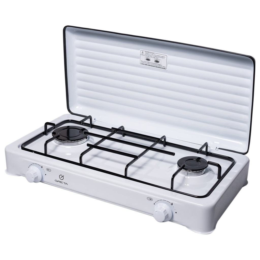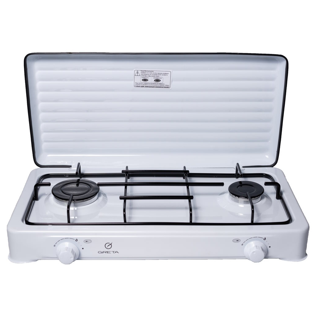 Настільна газова плитка, потужність 4600 Вт, 2 конфорки, механічне керування, поворотні перемикачі, металева кришка, колір - білий