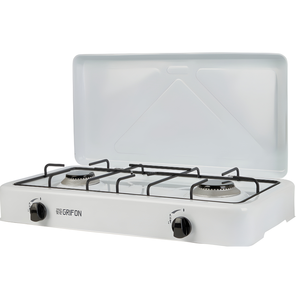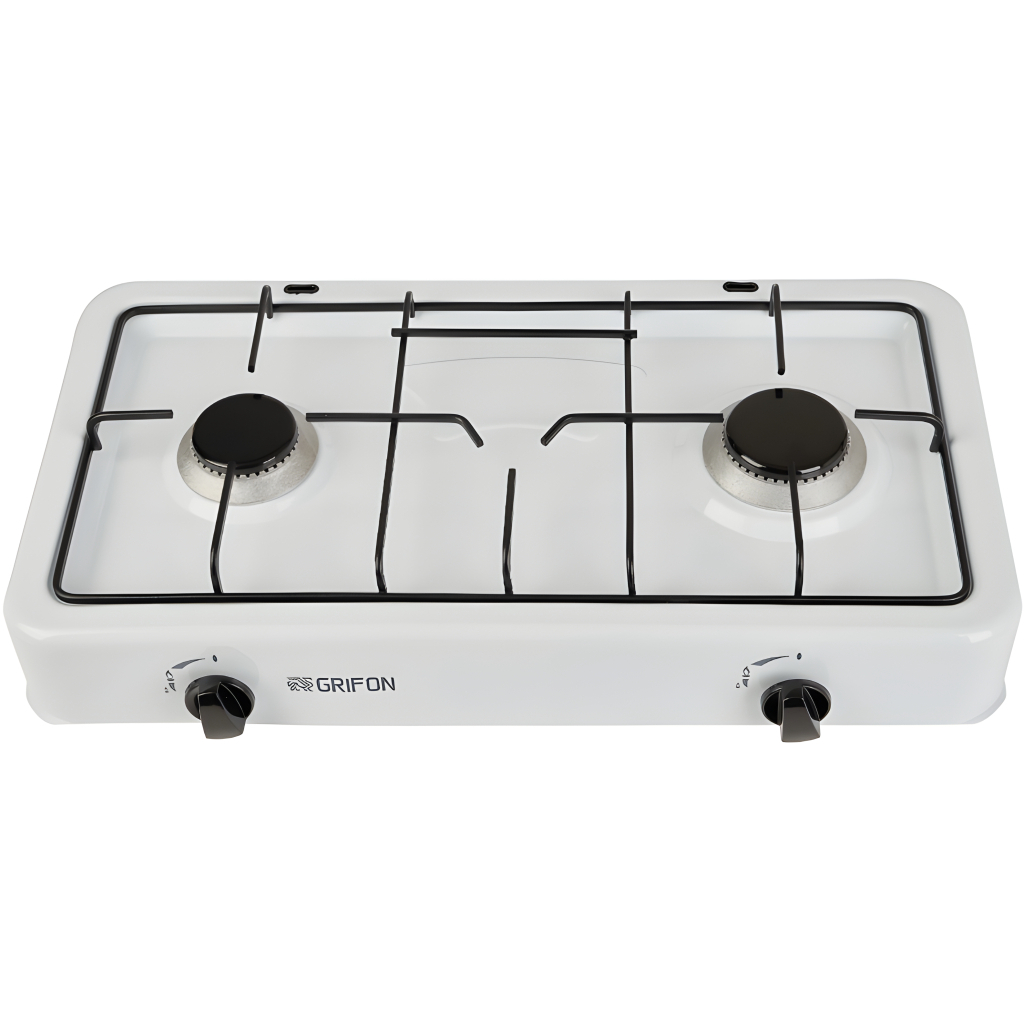 Настільна газова плита Grifon GRT-200-W на 2 конфорки, з металевими гратами і кришкою, має жиклери під балонний газ.