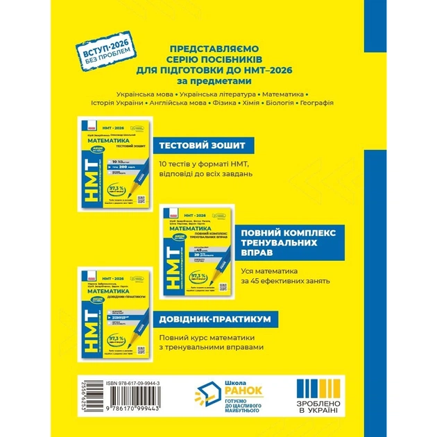 Посібник призначений для системного повторення курсу математики, відпрацювання практичних умінь і навичок та ефективної підготовки до національного мультипредметного тесту (НМТ) з математики.