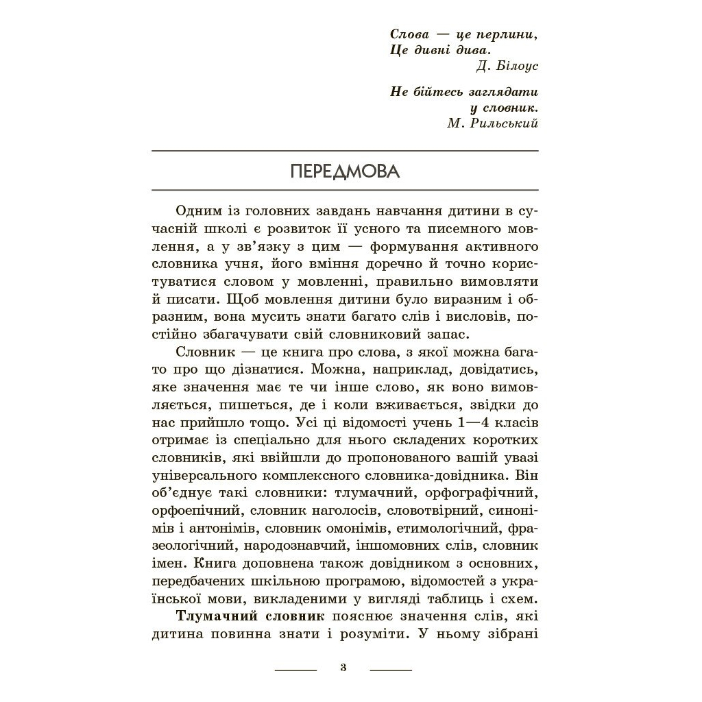 слів, імен, а також короткий довідник з української мови. За допомогою цього збірника учень зможе поповнити свій словниковий запас, навчиться доречно вживати слова у своєму мовленні, розрізняти синоніми, антоніми й омоніми, виконувати словотвірний аналіз слова, повторити всі орфограми з курсу української мови, підготуватися до контрольної роботи.
