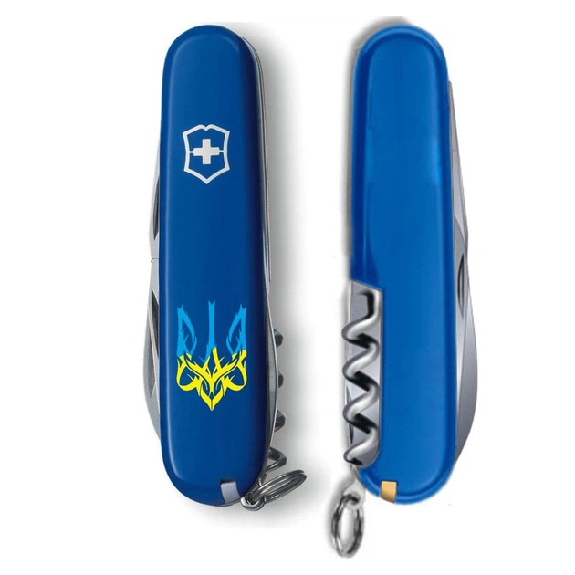 Швейцарський кишеньковий ніж з патріотичної лінійки SPARTAN UKRAINE від Victorinox. Культовий дизайн середнього розміру - 91 мм. Глянцеві чорні накладки доповнені якісним друком Тризуба синьо-жовтого кольору.