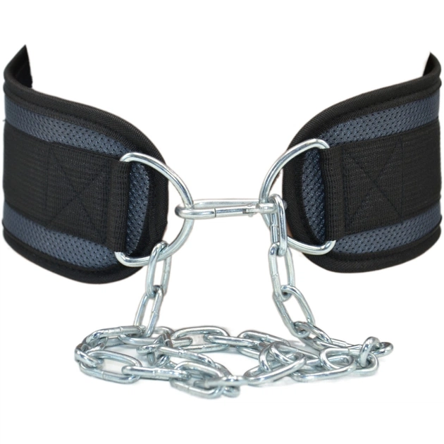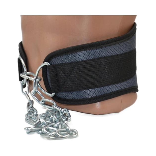 Чорно-сірий неопреновий пояс використовується для підвішування додаткової ваги при зміцненні рук, плечей, грудей і є абсолютно необхідним аксесуаром при тренуванні м'язів спини або трицепсів. Міцна нейлонова конструкція гарантує міцність і довговічність. Сталевий карабін дозволяє дуже легко відкривати та закривати ремінь.