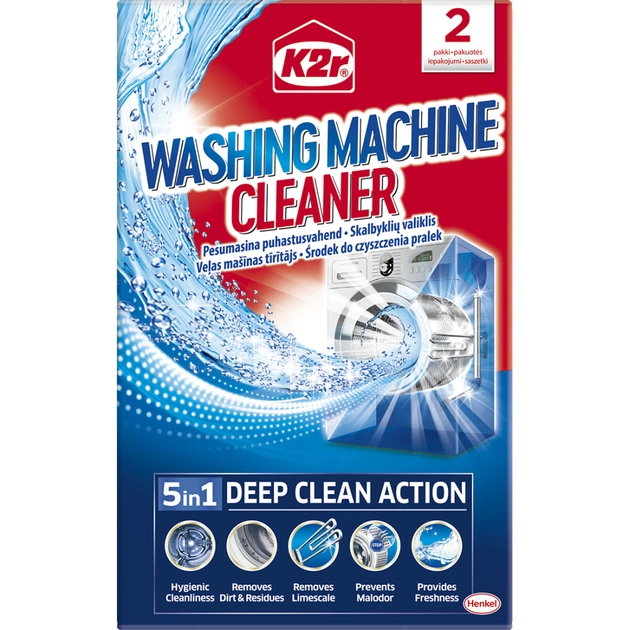 Під час своєї роботи пральна машина накопичує осад та залишки мийних засобів усередині барабана, а після прання найчастіше виникає неприємний запах. Щоб уникнути цих проблем, K2r представляє Очисник для пральних машин 5 в 1 Діп Клін Екшн, який завдяки своїм функціям усуває забруднення всередині барабана та забезпечує глибоке очищення, запобігаючи появі неприємного запаху. Крім цього, засіб видаляє вапняний наліт, що утворюється на важливих деталях пральної машини, що забезпечує свіжість у всіх внутрішніх частинах.