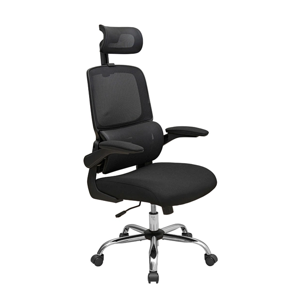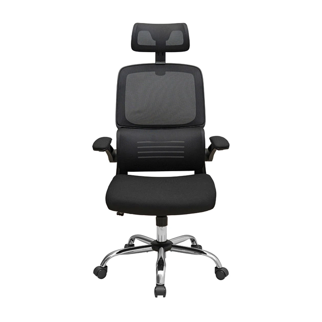 Каркас крісла виготовлений з приємного на дотик чорного пластику та доповнений хромованою декоративною вставкою на спинці, що додає елегантності його вигляду. Спинка оббита повітропроникною сіткою, що забезпечує комфорт у спекотну пору року, і має автоматичний поперековий підпір для додаткової зручності.