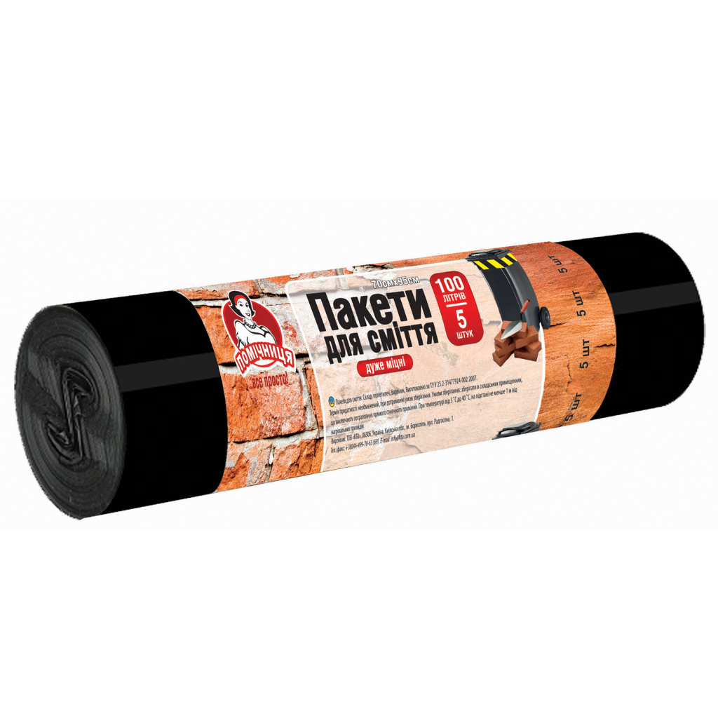 Пакети для будівельного сміття ТМ "Помічниця" чорні — це серія великих пакетів для професійного використання та спеціальних потреб.Висока міцність та еластичність поліетилену високого тиску зумовлює стійкість до проколів та розривів.Мішки вирізняються особливою міцністю, що так необхідно під час роботи з будівельним та іншим габаритним сміттям.Пакети розділені якісною перфорацією, яка не пошкоджує пакет на момент відриву від рулону.Великий об'єм пакетів 100 літрів дають змогу легко утилізувати будівельне сміття.