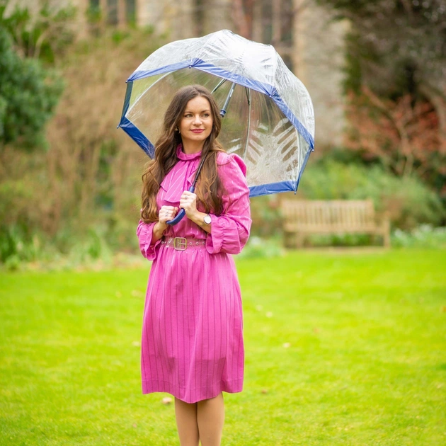 Прозорий купол з поліхлорвінілу з рожевими вставками діаметром 84 см має оригінальну конструкцію birdcage та забезпечує надійний захист від негоди, повністю приховуючи свою власницю від дощу та вітру. Парасолька відкривається та закривається вручну (механіка).
