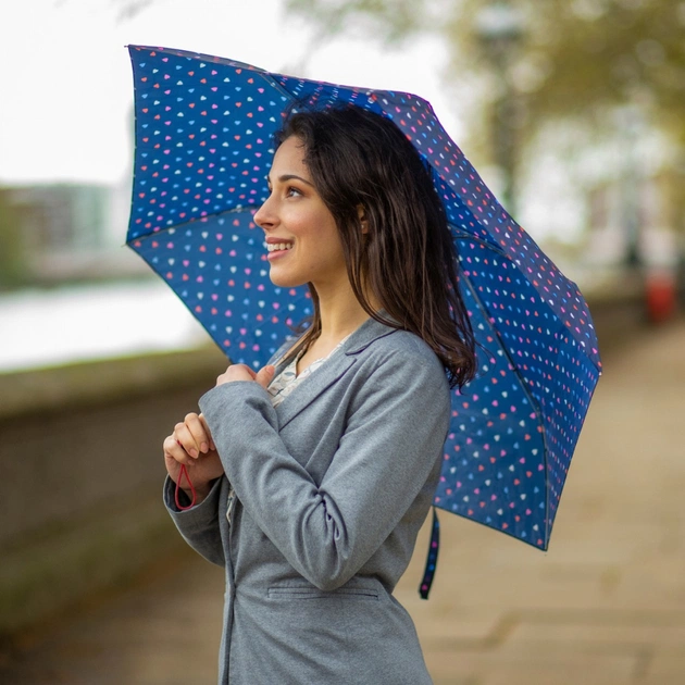 Суперлегка парасолька Fulton Superslim-2 з безліччю різнокольорових сердець по куполу подарує романтичний настрій під час похмурих дощових днів.