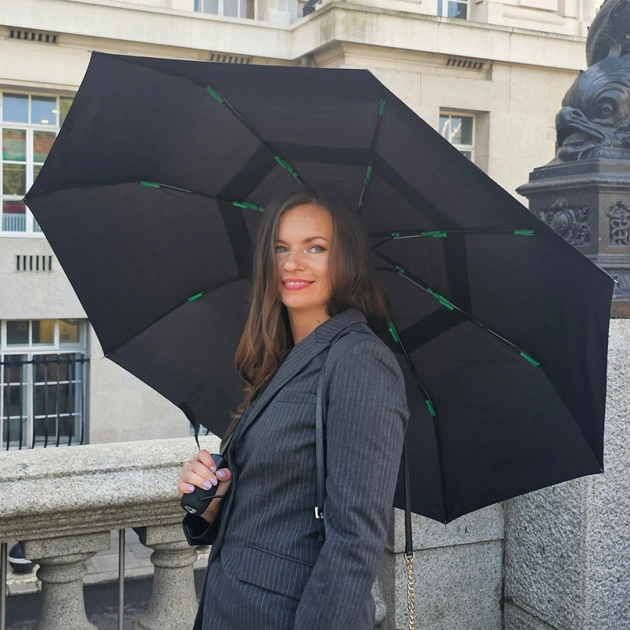 Нейтральний і універсальний чорний колір парасольки не змусить підбирати гардероб, чорний актуальний скрізь і завжди. Дизайнерський чохол з зеленими вставками дуже гарний і зручний в користуванні, а завдяки великому отвору, парасольку дуже легко виймати і ховати.