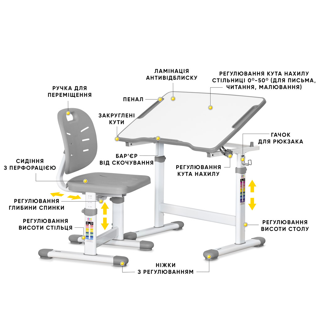 Глибина сидіння і висота стільця легко налаштовуються під зріст дитини. Надійний бар’єр запобігає скочуванню зошитів, а заокруглені кути гарантують безпеку під час використання.