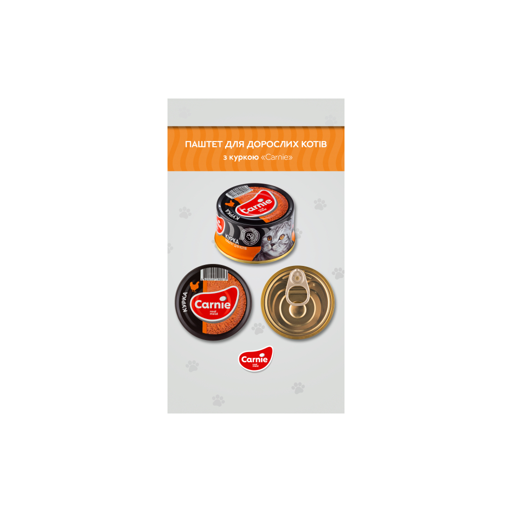 Вологий корм Carnie — це корм суперпреміумкласу, що виробляється з дієтичної птиці. Повноцінні та повнораціонні беззернові паштети Carnie з високим вмістом справжнього м'яса та високим рівнем поїдання й засвоєння поживних речовин, що сприятливо впливає на здоров'я та настрій вашого хатнього вихованця. Паштет розроблений за унікальною рецептурою.