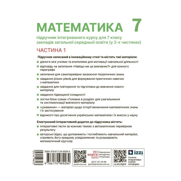Підручник Математика. Інтегрований курс. Для 7 класу ЗЗСО (у 2-х ч.). Частина 1 Ранок (9786170989284)