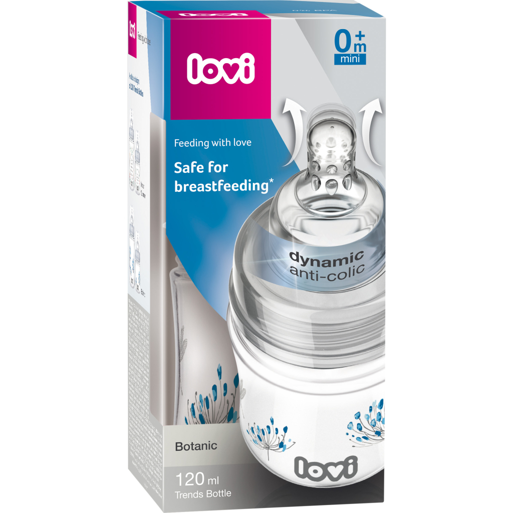 Пляшка Lovi Trends Botanic стимулює активне смоктання й дає змогу поєднувати грудне вигодовування з годуванням із пляшечки.