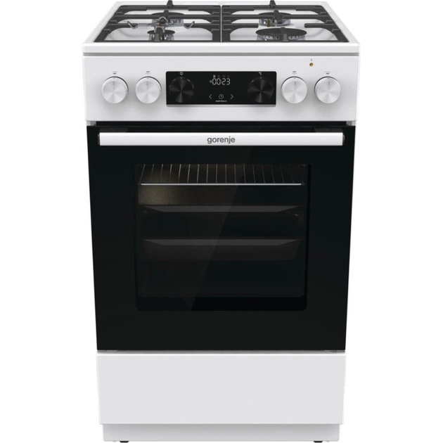 Плита комбінована Gorenje GK5C43WF — це стильне та функціональне рішення для вашої кухні. Завдяки поєднанню газової варильної поверхні та електричної духовки, цей прилад забезпечує максимальну зручність у використанні. Варильна поверхня обладнана чотирма конфорками, включаючи додаткову та велику конфорку, що дозволяє ефективно готувати страви різних типів. Конфорки мають різну потужність: ліва передня — 1 кВт, права передня — 3 кВт, ліва задня — 1.9 кВт, права задня — 1.9 кВт. SoftClose шарнір забезпечує плавне закриття дверцят духовки, а унікальна форма Homemade створює оптимальні умови для випікання. Духовка оснащена електронним програматором IconLed, що полегшує налаштування приготування страв.
