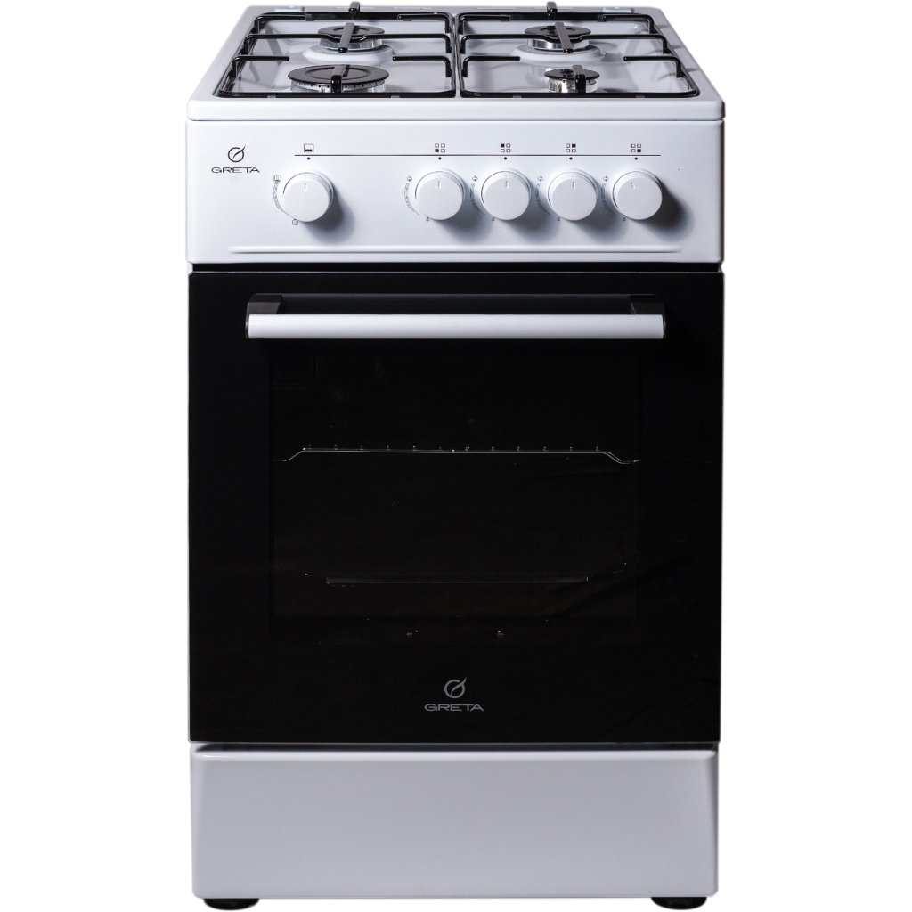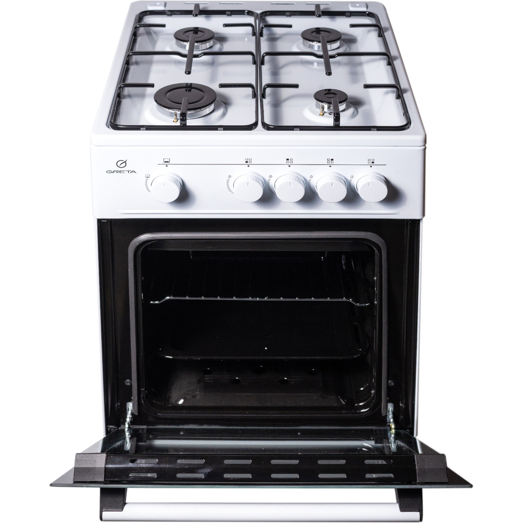 Газова плита, 4 газові конфорки, газ контроль конфорок та духовки, решітка сталева, газова духовка об'ємом 54 л, механічне керування, ширина 50 см.
