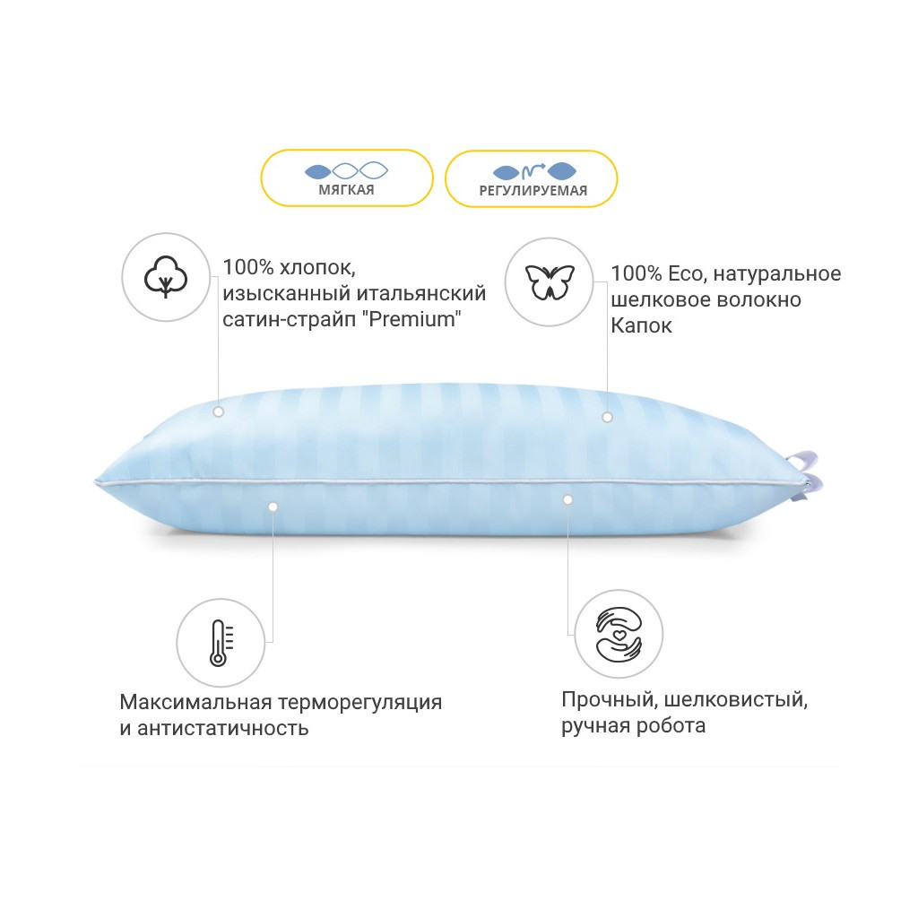 Низька — оптимально розрахована вага наповнювача для досягнення гарних показників за пружністю. Ця висота прекрасно підійде людям, які люблять низькі та дуже м'які подушки. Рекомендовано для дітей і жінок. Також не хочеться втратити можливість підкреслити величезний плюс подушок — вони регульовані! Вся принадність у тому, що в подушці є вбудована блискавка (вона розмішена збоку подушки), завдяки якій ви в будь-який момент зможете вийняти трохи наповнювача та підлаштувати подушку повністю під себе.
