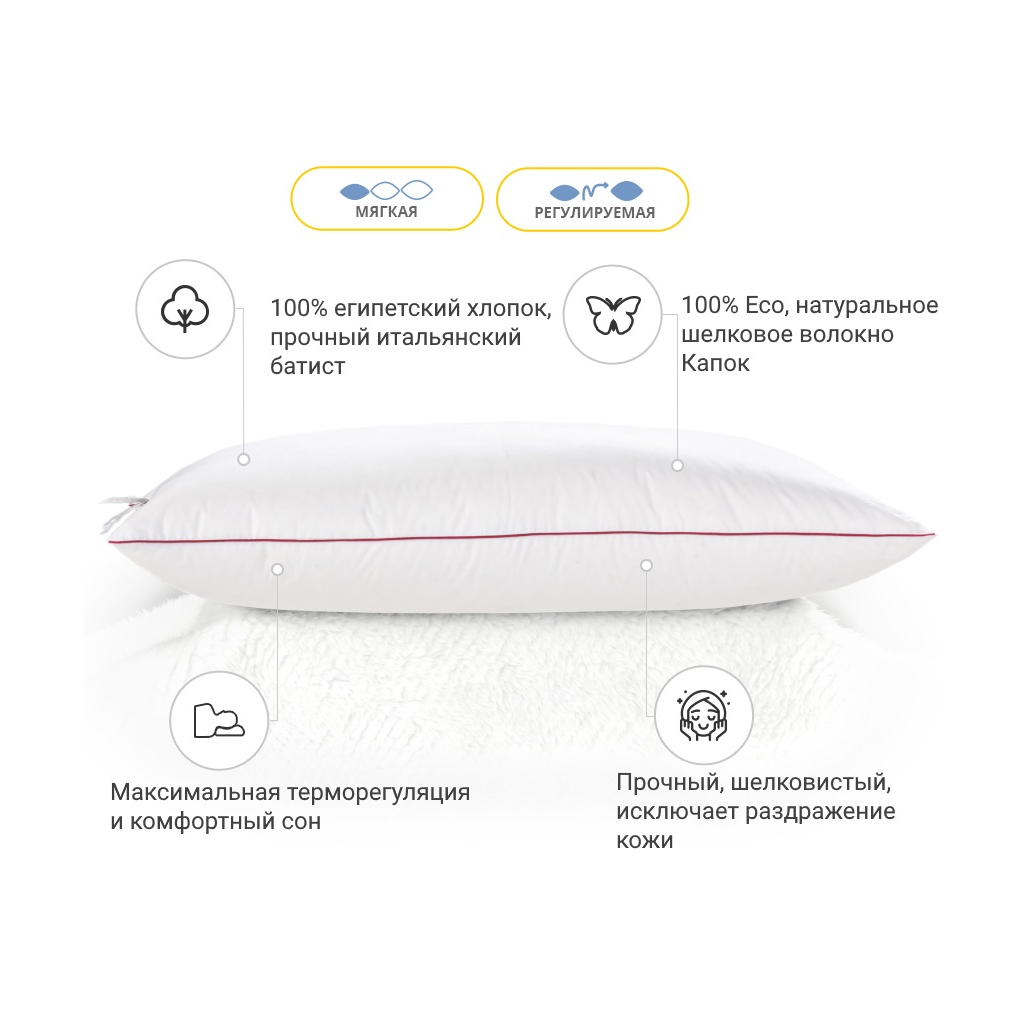 Основною перевагою шовкових подушок є натуральний шовк — єдиний природний матеріал, який не викликає алергічних реакцій, гігроскопічний, стійкий до перепадів температур, тривалий термін експлуатації, гіпоалергенний, антистатичний, легкий, шовковистий, м'який і міцний, має гладку поверхню, що запобігає подразненню шкіри, має дивовижну терморегуляцію й підтримує комфортний мікроклімат у ліжку, не створює парникового ефекту. Подушка Deluxe Hand Made підійде людям, які люблять середні, у міру пружні подушки. Подушку можна віднести до розряду стандартних, середніх за м'якістю та висотою подушок. Висота подушки 11-14 см.
