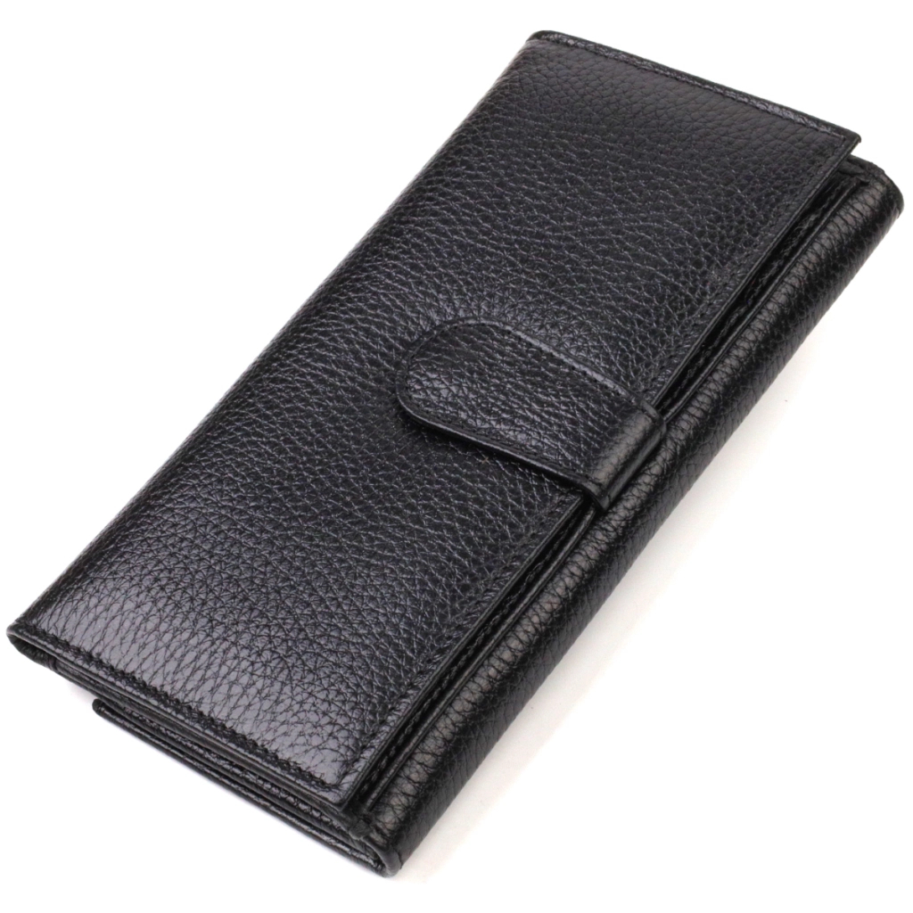Універсальний гаманець для стильних жінок з натуральної шкіри у класичному чорному кольорі. Аксесуар має одне основне відділення, сімнадцять кишень для карток, чотири прилеглі кишені та монетницю. Особливістю цієї моделі є наявність блоку для кредитних карток, який закривається хлястиком на кнопку. На лицьовій стороні, у правому нижньому куті, металевий логотип компанії виробника. Якщо ви вибрали товар цієї фірми, можете не сумніватися, що виріб прослужить дуже довго і не втратить свого первісного вигляду.