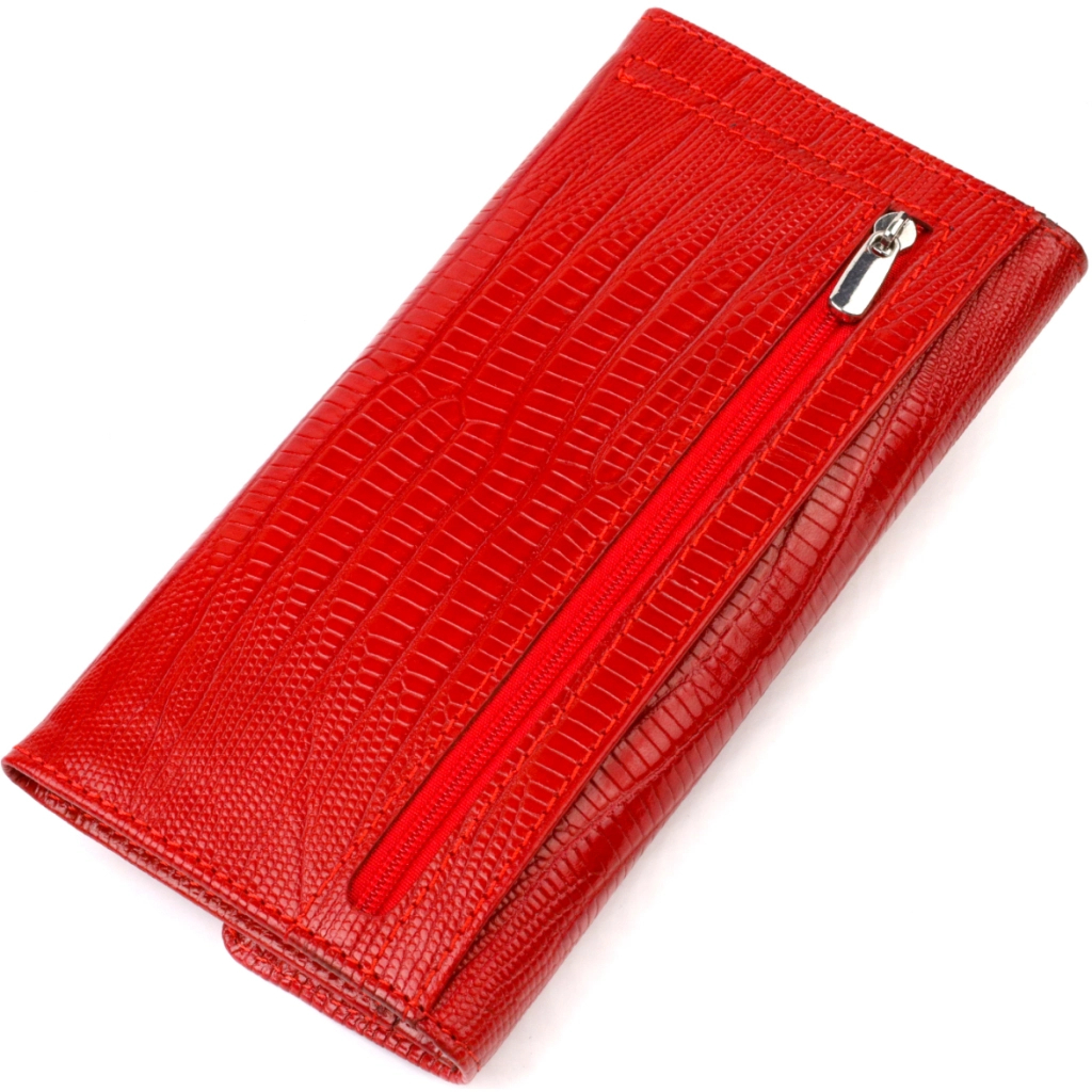Жіночий яскравий гаманець горизонтального типу із якісної натуральної шкіри з тисненням. Аксесуар має одне основне відділення, шість кишень для карток, чотири прилеглі кишені та монетницю. Закривається аксесуар навпіл клапаном на кнопку. Купуючи шкіряний аксесуар цієї фірми, собі або на подарунок, будьте певні, що він прослужить Вам не один рік.