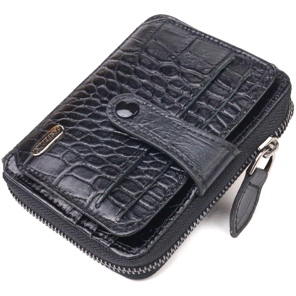 Цікавий гаманець для жінок із натуральної фактурної шкіри з тисненням під крокодила. Аксесуар має одне містке відділення, у яке поміщаються купюри всіх номіналів, одинадцять кишень для карток, включаючи блок для карток із зовнішнього боку, а також кишеню для пропуску під сіточкою з лицьового боку. Закривається аксесуар на блискавку, а блок для карток — хлястиком на кнопку. Фурнітура темного срібла додає стилю. Чудовий подарунок для дружини, дівчини або подруги.