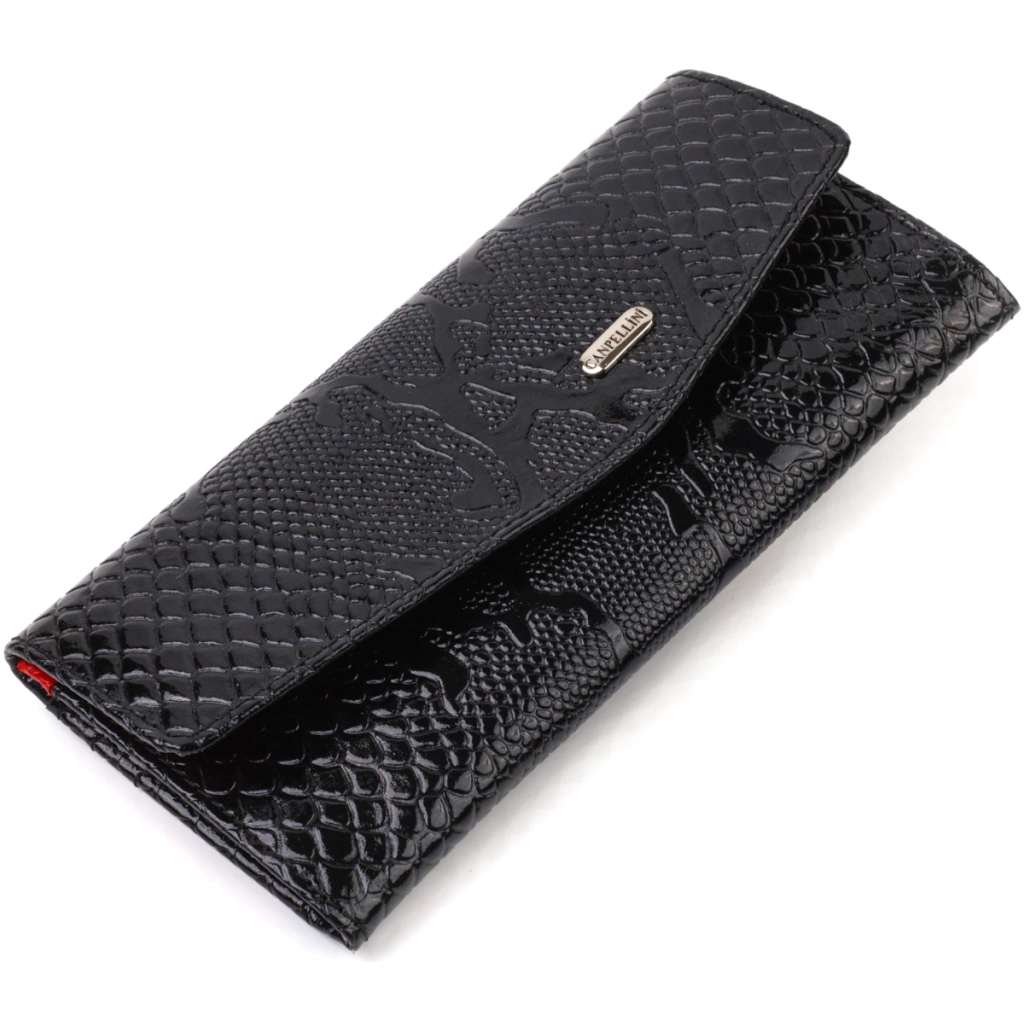Чорний лакований жіночий гаманець горизонтального типу із якісної натуральної шкіри з тисненням під рептилію. Аксесуар має одне основне відділення, вісім кишень для карток, чотири прилеглі кишені та монетницю. Закривається аксесуар навпіл клапаном на кнопку. Купуючи шкіряний аксесуар цієї фірми, собі або на подарунок, будьте певні, що він прослужить вам не один рік.