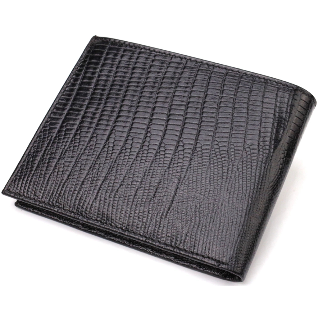 Стильний чоловічий гаманець із натуральної фактурної шкіри із тисненням. Аксесуар має основне відділення для купюр, дві кишені під сіточкою, дванадцять осередків під кредитки, три приховані кишені.