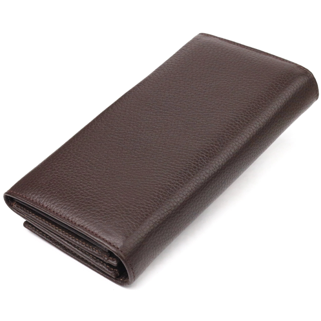 Цікавий горизонтальний жіночий гаманець з натуральної зернистої шкіри в модному коричневому кольорі. Аксесуар має три великі кишені для купюр, три прилеглі кишені, вісім осередків для карток, три з них під сіточкою, монетницю на блискавці. Виріб закривається клапаном на кнопку. Відмінна ідея для подарунка, яка не залишить байдужою жодну жінку.